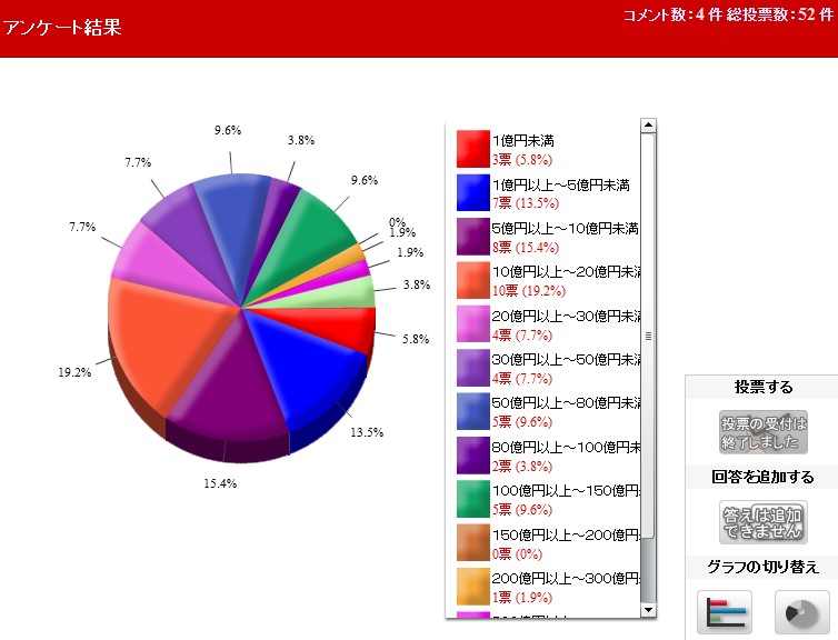 一番多かったのは、10億~20億で、19件19.2%でした。約2割の方がこれぐらいってことですよね~