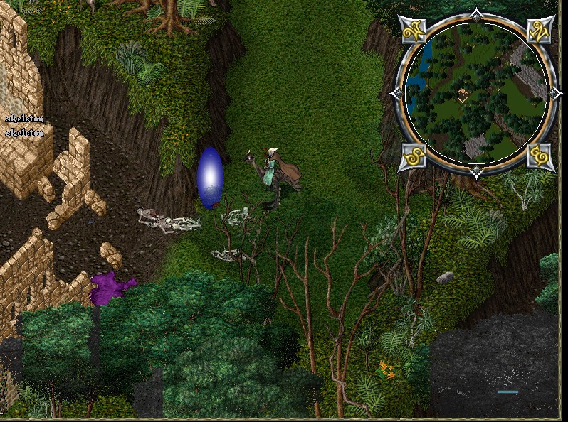 私、よく死ぬんです・・・・今日は、ドレイク奉納のためにデーモンテンプルに行きました。そこで、Gドラちゃんに130ものダメくらっちゃいまして^^;一撃死・・・復活して無事ドレイクテイム出来たのはいいんだけど、ドレイク2匹からたげもらっちゃいまして、ブレスに耐えながらお散歩テイムしてたんです・・・・目の前に、バラバラ死体が・・・これって通過できないんですよね~~~^^;ドレイクとバラバラ死体に挟まれて「チーン!」そして、なんとか、ドレイク2匹テイム終了していざ奉納ってことで動物園にゲート!ゲート先には、ゾンビやら赤ネームの堕落住民やら、シェイドやら・・・ドレイクで蹴り散らしましたが、1匹見過ごしていました・・・スケルタルアーマー!!!最初、なぜ、私のヒットポイントが減っているのかわかんなかったんだけど、透明のモンスに気づいた時には既に「チーン!!」