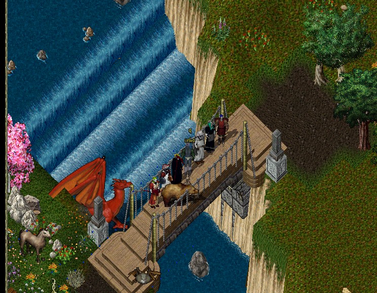 ユーのムーンゲートから走っていくことに^^;大滝のルーン持っている人はいても歩いていったことがない人ばっかりで・・・・得意の迷子です^^;途中。まったく反対方向のユーの刑務所によりました?(寄ったって言うのかいささか疑問^^;)このあたりから迷子さんが出はじめ、6人で出発した旅も目的地の滝には4人がたどり着きました。最終的には