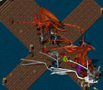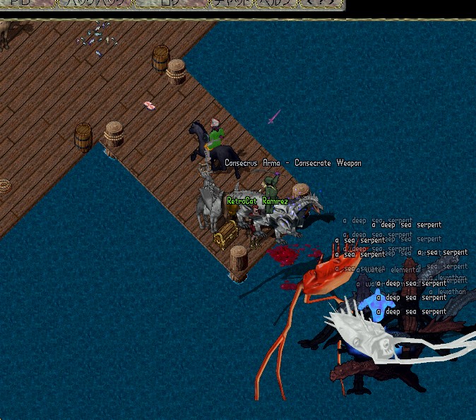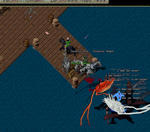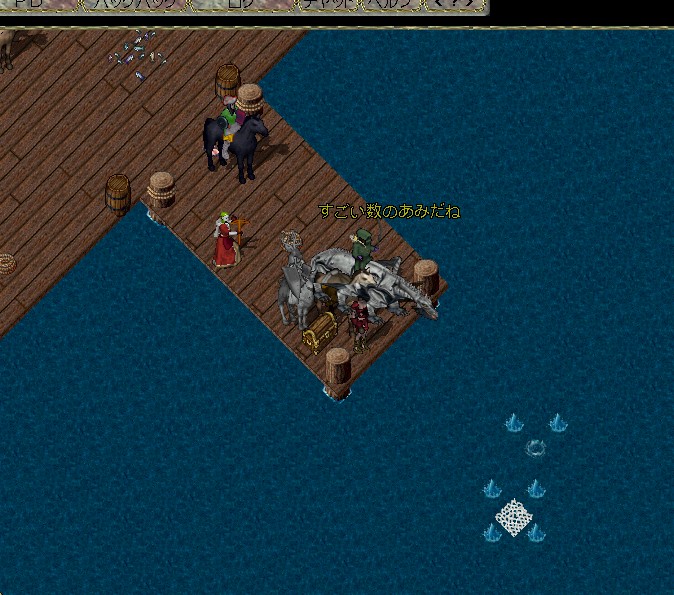 場所はバッカニアーズ デンの桟橋でやりました。船の上はあまりに危険ということです。デンは桟橋のすぐ近くに沖があるために陸上からフィッシングネットを投げることができるんです。赤い「イカ」がクラーケン、白い「イカ」がリバイアサン。このリバイアサンが強力・・・